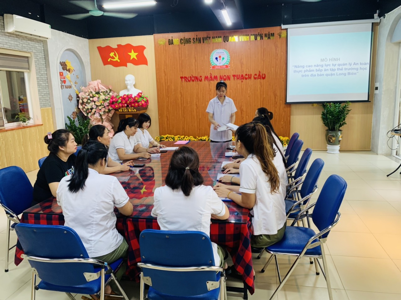 Đội ngũ giáo viên, nhân viên nhà trường được củng cố, trang bị những kiến thức mới nhất về phòng chống dịch bệnh, vệ sinh an toàn thực phẩm, điều kiện bảo đảm an toàn thực phẩm đối với bếp ăn tập thể; 10 nguyên tắc vàng trong chế biến thực phẩm an toàn; điều kiện về con người, điều kiện về cơ sở vật chất, trang thiết bị dụng cụ; những nguy cơ về mất an toàn thực phẩm: từ các nguyên vật liệu dùng để chế biến; từ các dụng cụ trong quá trình chế biến, từ quá trình chế biến; quá trình chia thức ăn; trong quá trình bảo quản, vận chuyển thức ăn...