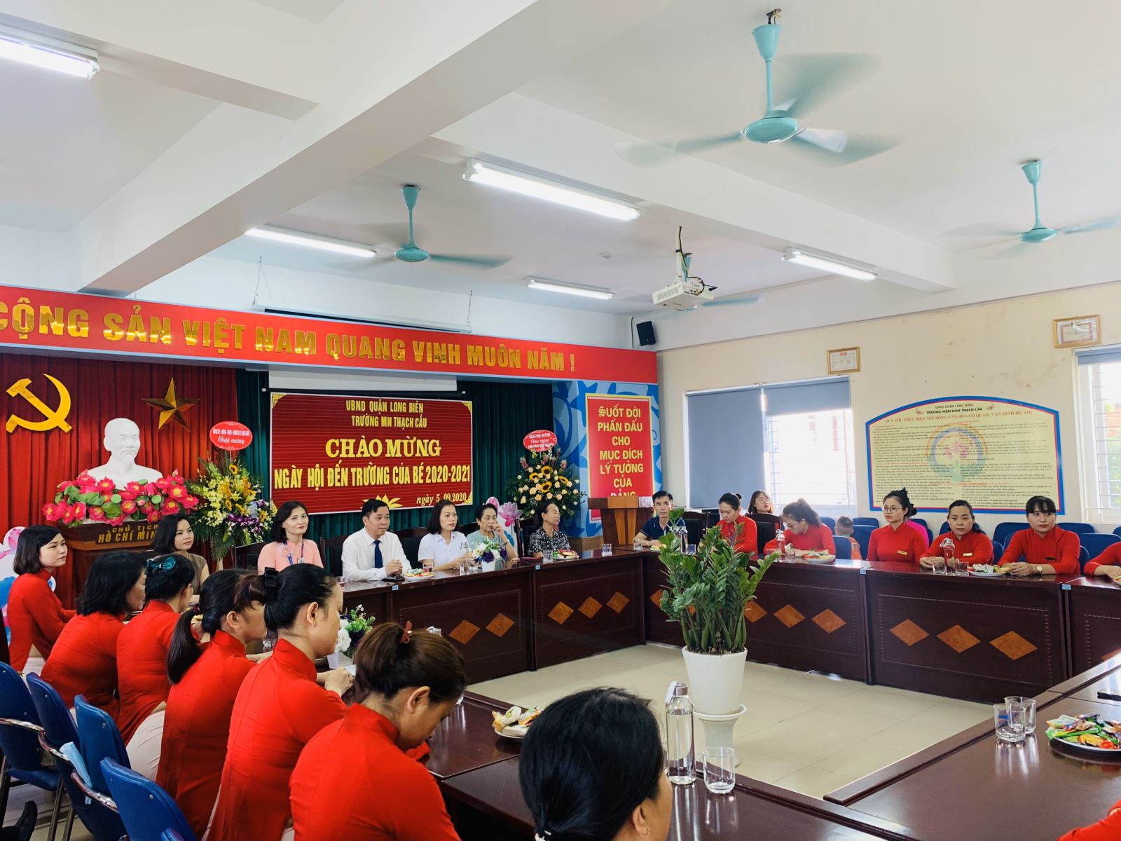 Năm nay là một mùa tựu trường rất khác, khi mà do ảnh hưởng của Covid-19 các trường mầm non đều tổ chức lễ khai giảng tại lớp thay vì khai giảng tập trung như mọi năm. Đúng 7h30, 100% CBGVNV nhà trường có mặt tại hội trường gặp mặt tổ chức với không khí vui tươi, ngắn gọn và trang trọng.