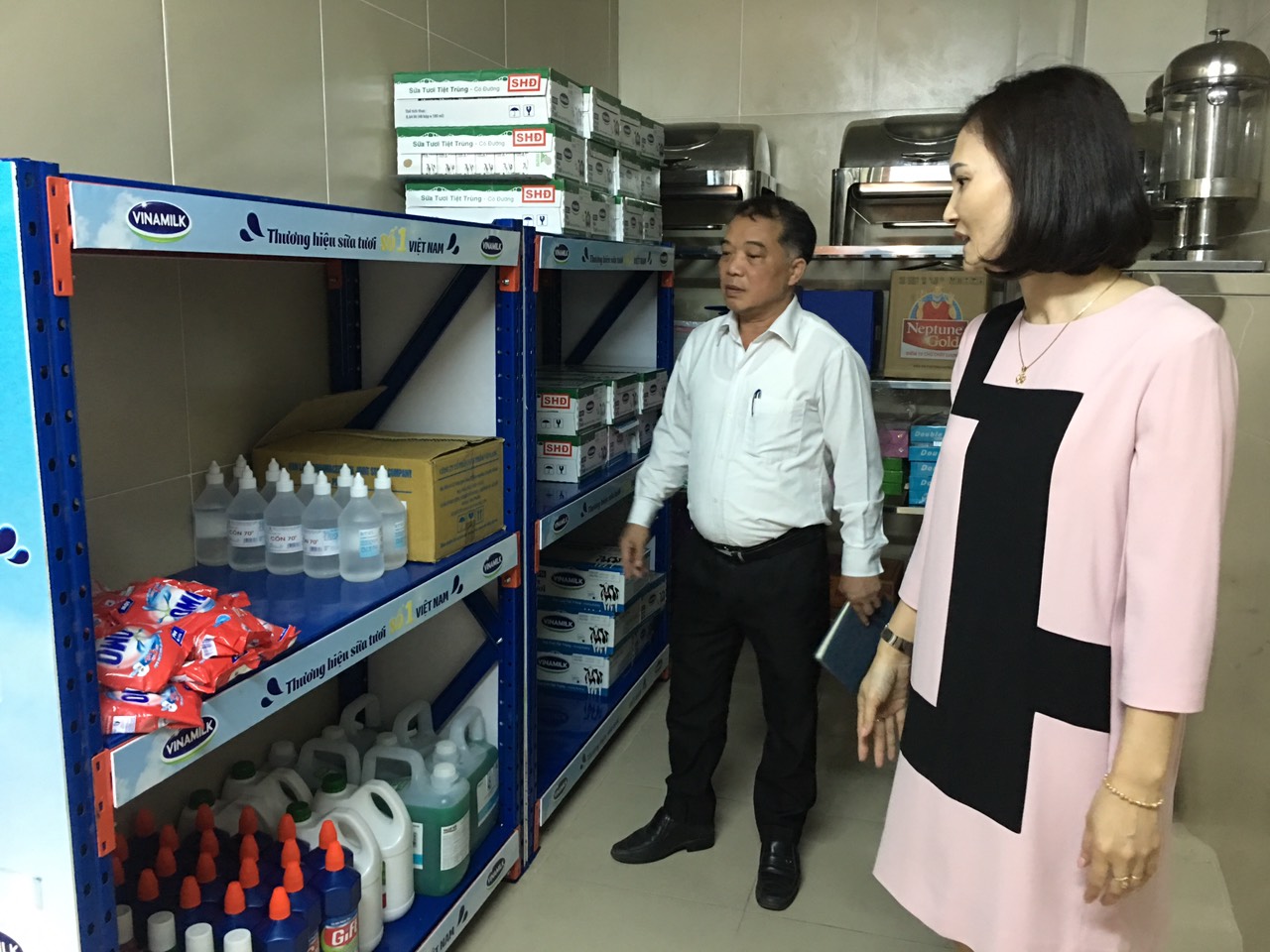 Các đồng chí trong đoàn đi kiểm tra toàn bộ khu vực để dung dịch rử tay công cộng cũng như của các lớp, nhà vệ sinh chung, phòng cách ly khi có trường hợp nghi nhiễm, các phòng chức năng, cầu thang, hành lang, kho để vật tư y tế....