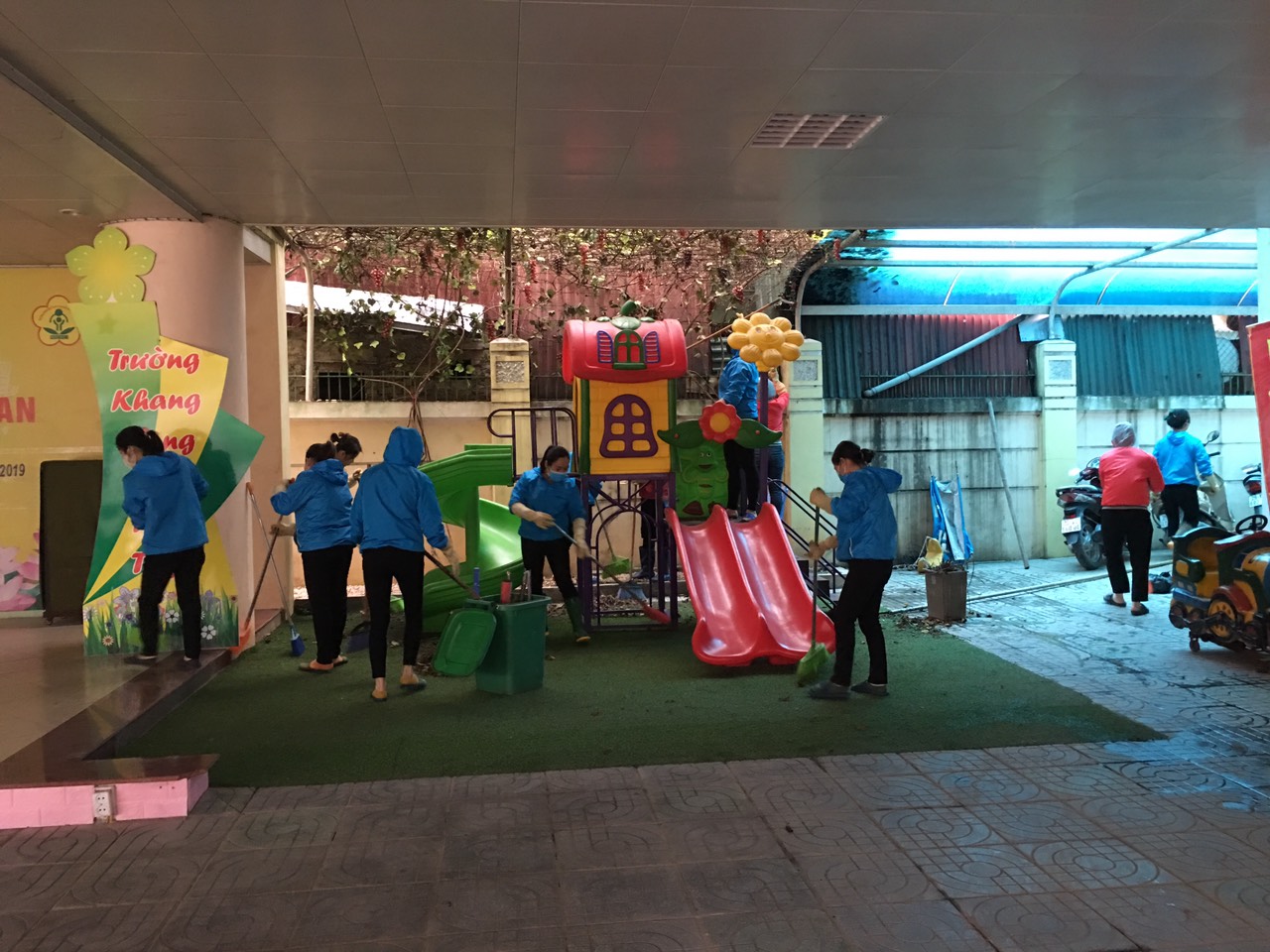 Các lớp học vệ sinh toàn bộ các cửa ra vào, cửa sổ, bàn, ghế, giường, tủ, giá đựng đồ dùng, đồ chơi, nền nhà, hành lang, tủ đựng đồ cá nhân của trẻ..đều được lau bằng dung dịch cloramin B.