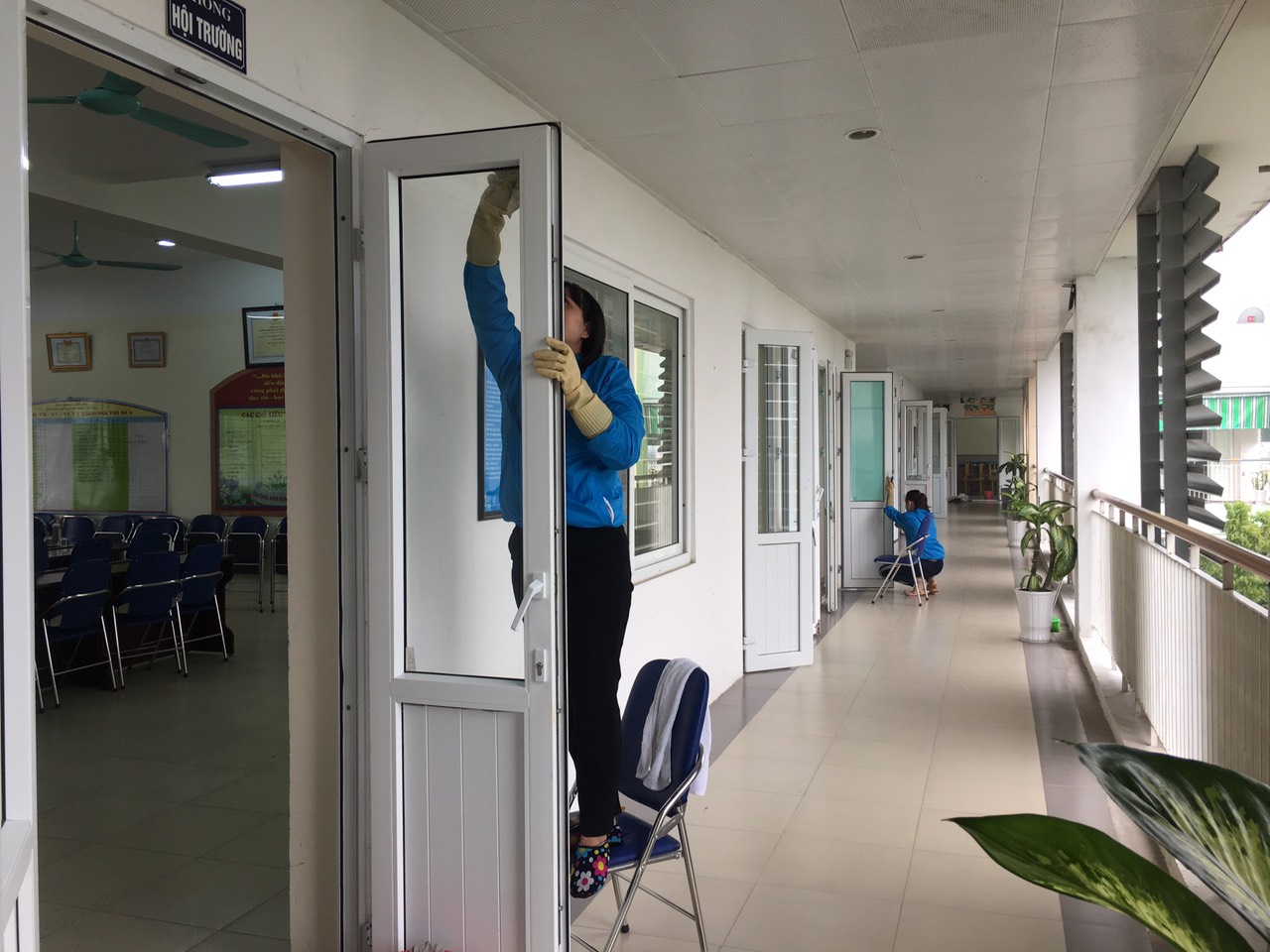 Hành lang, cầu thang , sảnh cũng như các phòng chức năng vệ sinh sạch sẽ, sắp xếp đồ dùng gọn gàng, các cống được rắc vôi bột, phát quang cây cối, sắp xếp gọn gàng, thùng rác cọ rửa, vệ sinh sạch sẽ.....