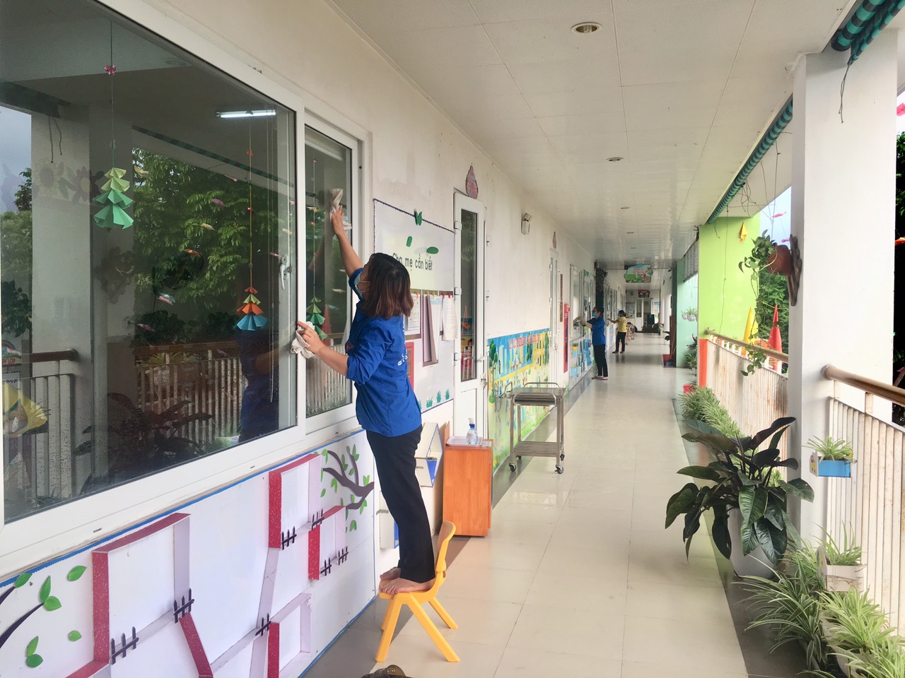 100% các lớp lau dọn vệ sinh khu vực trong lớp, sắp xếp đồ dùng, đồ chơi gọn gàng , ngăn nắp. Nhân viên bảo vệ nhà trường phun dung dịch Clo toàn bộ các hành lang, cầu thang, khu vui chơi dưới sân trường, bếp, khu vực hành chính, các lớp, đặc biệt các tay nắm vịn của cửa ra vào, cầu thang, lan can, những vị trí tiếp xúc với tay nhiều nhất sau đó lau sạch sẽ bằng khăn sạch và để khô.