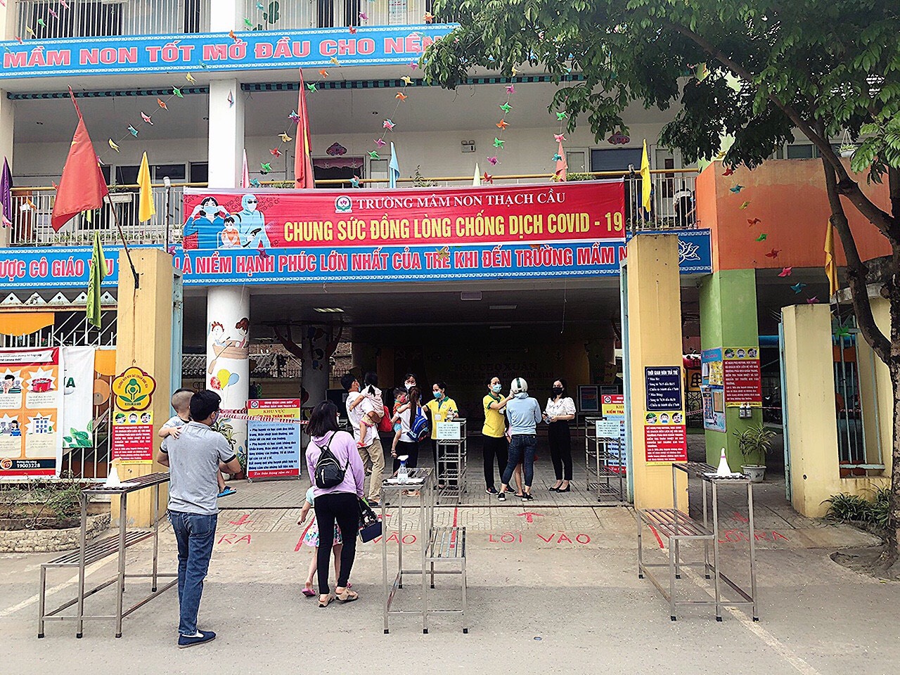Khi các con và các bậc phụ huynh đến trường, ngay tại cổng trường các cô sẽ kiểm tra thân nhiệt và sát khuẩn tay nhanh đồng thời hướng dẫn phụ huynh lên xuống theo một chiều đảm bảo phòng chống dịch bệnh. Sau hơn 3 tháng trở lại trường, trên gương mặt của các con đều ánh lên niềm vui sướng khi được gặp các bạn, các cô. 100% phụ huynh và các con ngày đầu tiên khi đến trường đều thực hiện nghiêm túc tờ khai y tế , phối hợp với nhà trường các biện pháp phòng chống dịch bệnh trong thời kỳ bình thường mới một cách có hiệu quả.