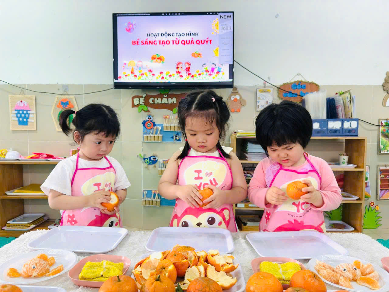 Trong giờ học tạo hình, các bạn nhỏ lớp MGB C2 đã được tham gia hoạt động sáng tạo với nguyên liệu vô cùng gần gũi – những quả quýt quen thuộc trong đời sống hằng ngày.