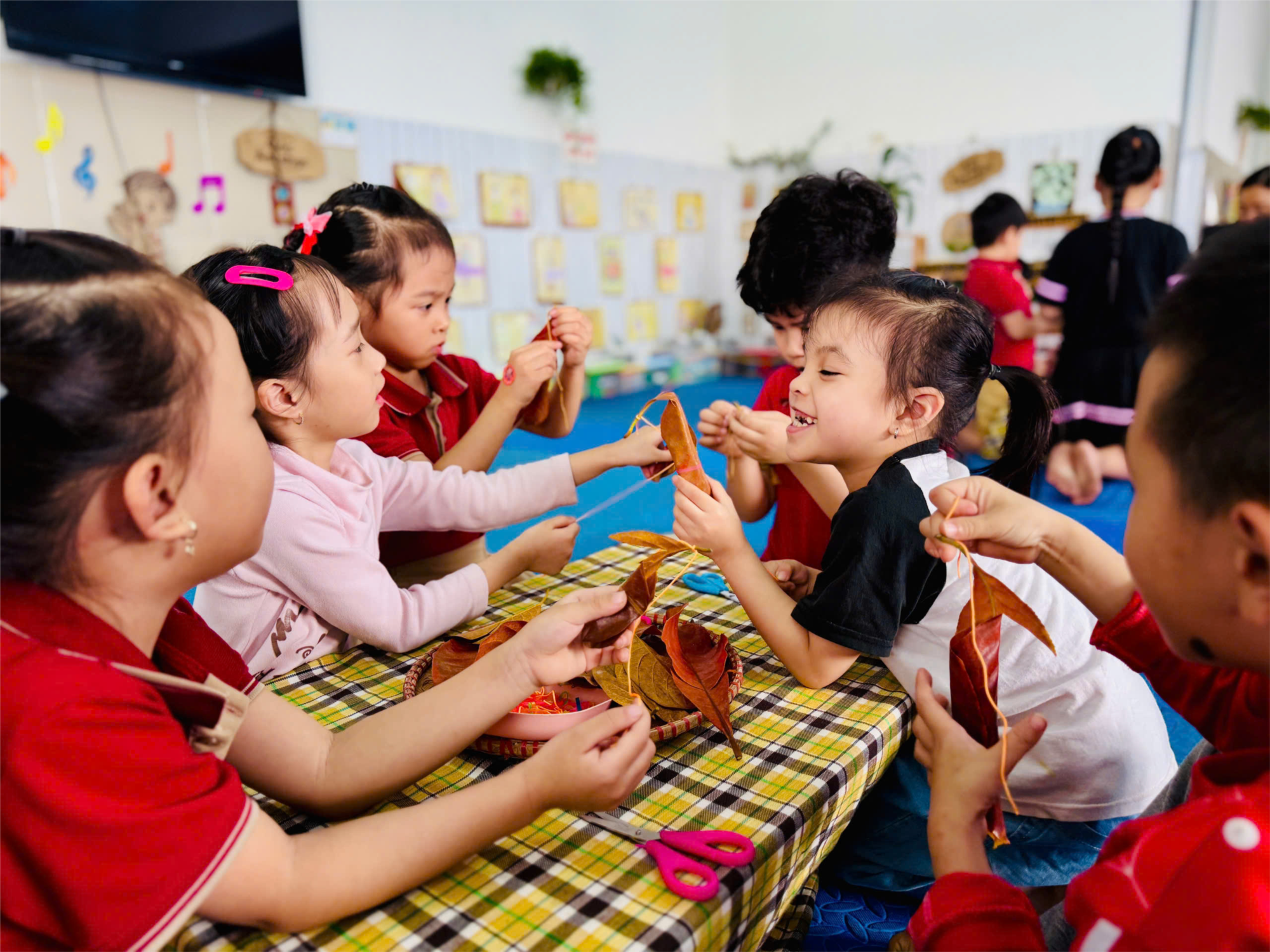 Dưới sự hướng dẫn của giáo viên, các bé đã khéo léo lựa chọn, sắp xếp và dán những chiếc lá để tạo nên hình dáng những chú nghé ngộ nghĩnh. Mỗi sản phẩm mang một nét riêng, thể hiện trí tưởng tượng phong phú và sự tỉ mỉ của từng bạn nhỏ. Không khí lớp học vì thế trở nên vô cùng sôi động, tràn ngập tiếng cười và sự hào hứng.