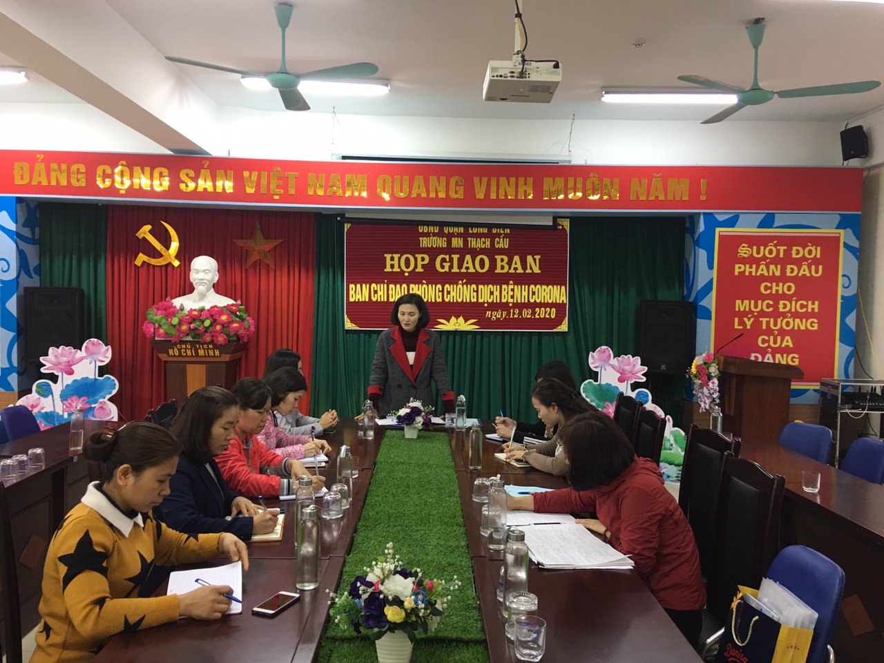 Sáng ngày 12/2/2020, trường MN Thạch Cầu tổ chức họp giao ban ban chỉ đạo công tác phòng chống dịch bệnh lần thứ 3 về công tác PCDB và công tác chuẩn bị đón trẻ đi học trong tuần tới. Trong cuộc họp, các thành viên trong ban chỉ đạo báo cáo đồng chí trưởng ban các nội dung về công tác phòng dịch của các bộ phận và công tác chuẩn bị đón trẻ tới trường trong tuần tới đảm bảo vệ sinh an toàn.