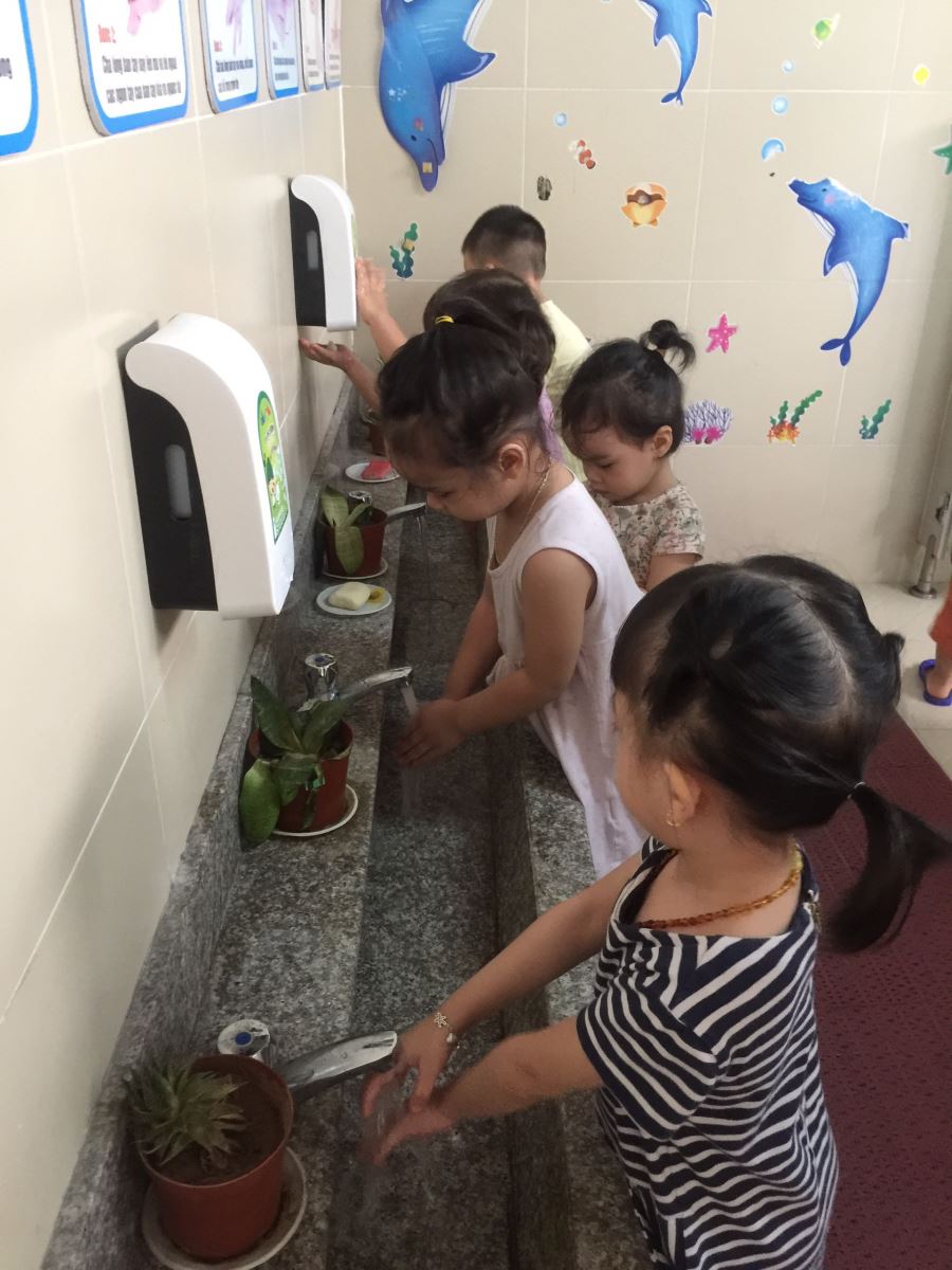 Do tình hình dịch bệnh Covid-19 diễn ra ngày một phức tạp nên các bé được các cô hướng dẫn cách phòng chống dịch bệnh bằng cách rửa tay thường xuyên bằng xà phòng và dung dịch sát khuẩn
