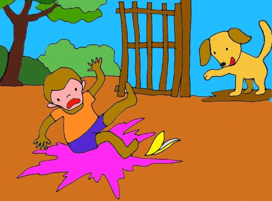 Vừa nói dứt lời thì khỉ bị trượt chân, ngã xuống đất một cái thật đau. A ! hóa ra là những vỏ chuối mà Khỉ con vứt bừa bãi hồi trưa đã làm Khỉ con ngã đấy! Thấy Khỉ con ngã, chó vàng chạy đến đỡ Khỉ con dậy. Sau đó chó vàng nhặt tất cả những vỏ chuối đang nằm rải rác trên sân bỏ vào thùng rác. Khỉ con cảm ơn chó Vàng rồi ngượng ngùng nói với bạn: