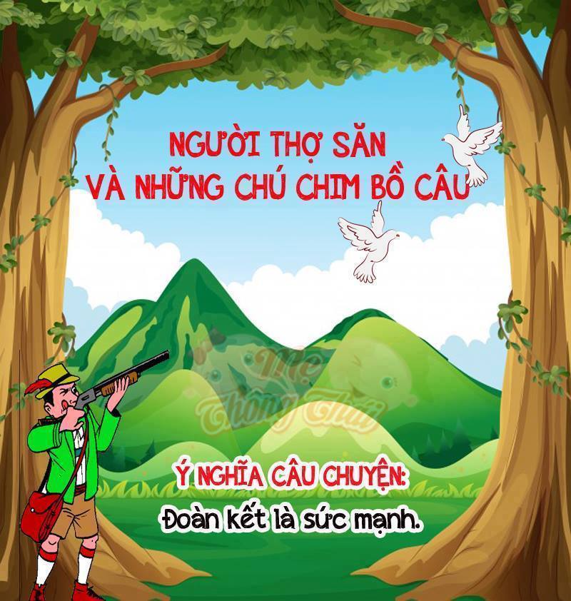 Đúng lúc này, có một đàn chim bồ câu đang bay gần đó. Chúng nhìn thấy có rất nhiều hạt thóc nên đã sà xuống ăn. Chẳng mấy chốc, chúng bị mắc kẹt trong chiếc lưới của người thợ săn. Dù rất sợ hãi nhưng con chim đầu đàn đã nghĩ ra một kế hoạch. Nó bảo với cả đàn: “Trong khi người thợ săn chưa quay về, chúng ta hãy hợp lực lại để mổ rách chiếc lưới này. Sau đó, một con sẽ thoát ra và tìm kiếm sự giúp đỡ”.