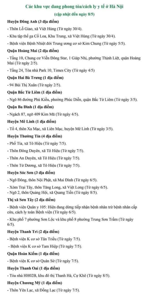 Dưới đây là danh sách các địa điểm cách ly y tế tại Hà Nội